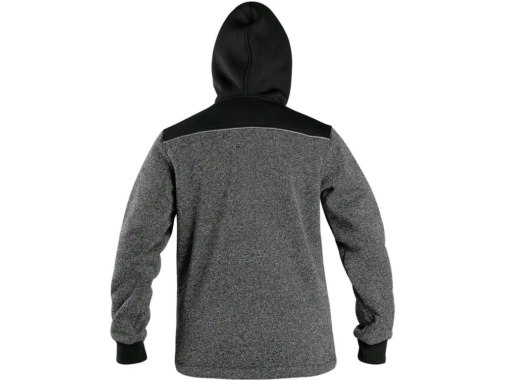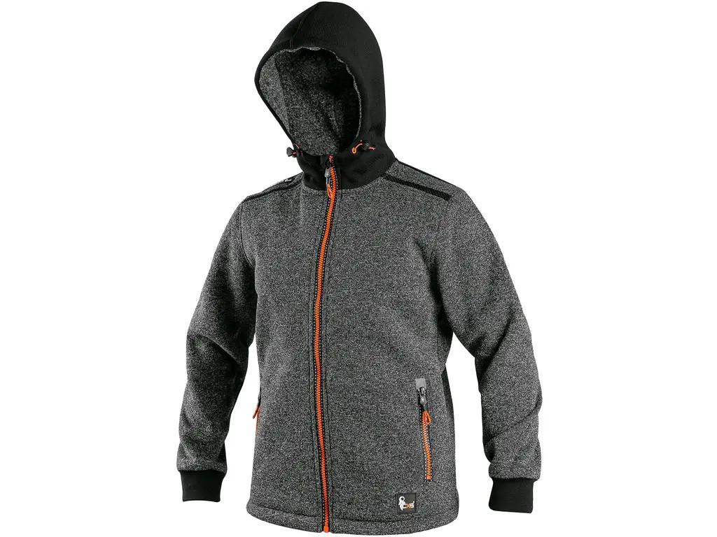 Jachetă pentru copii din material tricotat, cu glugă fixă și accesorii contrastante. Dispune de strângere reglabilă în partea de jos, mâneci cu manșete elastice, 2 buzunare laterale cu fermoar și accesorii reflectorizante pentru siguranță. Ideală pentru confort și stil.