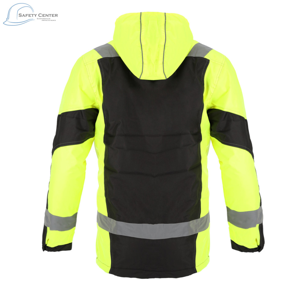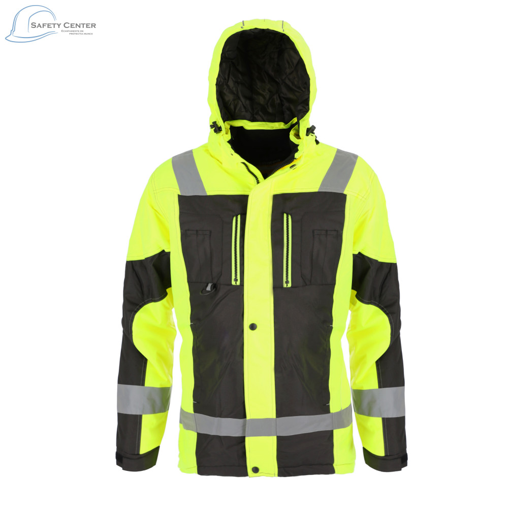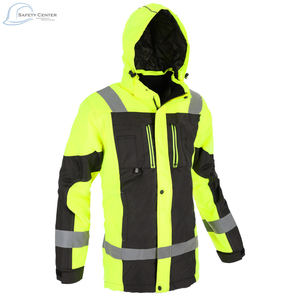 Jacheta GRAVITY LONG izolată este fabricată din material Oxford impermeabil (100% poliester, cu PU impregnat intern). Are o lungime extinsă și se închide cu un fermoar acoperit cu o clapă cu nasturi presați. Dispune de numeroase buzunare funcționale, inclusiv buzunare exterioare: buzunare cu fermoar pe piept, buzunare pentru scule, două buzunare inferioare, și buzunare interioare: un buzunar plasă pentru accesorii de iarnă, un buzunar pentru smartphone cu închidere velcro, și un buzunar interior pe piept cu fermoar. Pentru o vizibilitate sporită, jacheta are benzi reflectorizante pe corp și mâneci. Gluga izolată este detașabilă și are elemente reflectorizante, benzi elastice și opritoare pentru o reglare completă și potrivire optimă. Gulerul înalt este rezistent la vânt și are o garnitură interioară din lână moale. Manșetele sunt finisate cu o coadă și pot fi ajustate cu Velcro. Căptușeala este matlasată din poliester, iar cusăturile sunt rezistente la apă. Jacheta respectă standardul EN ISO 13688:2013 și este disponibilă în mărimi de la S la XXXL. Culorile disponibile sunt Galben HV/Negru.