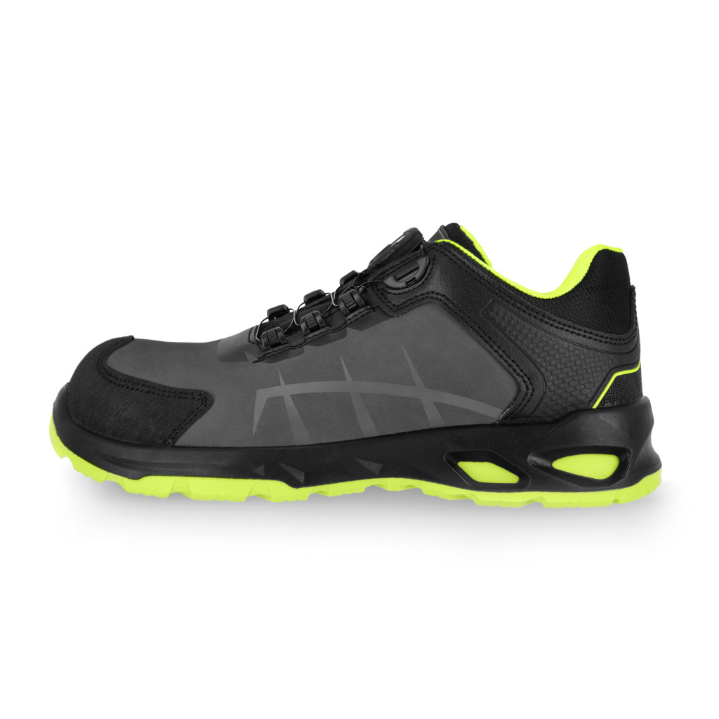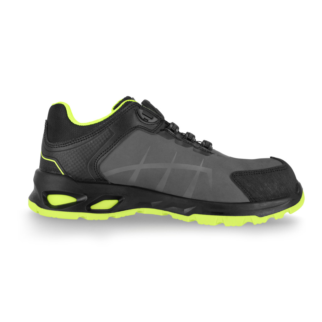 Pantofi de siguranță NEXO S3L, cu sistem de șireturi SPINPRO, fabricat din piele nubuc. Protecție din oțel și inserție anti-puncție din Kevlar. Talpă antistatică, anti-alunecare și rezistentă la ulei. Brant confortabil și căptușeală ventilată. Mărimi: 39-47. Ambalare: 1/10 cutie.